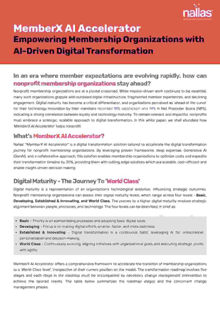 Our latest white paper unveils MemberX AI Accelerator, Nallas’ Digital Transformation framework to fast-track your organization’s transformation journey by 30%, embed GenAI from the start, and drive measurable ROI.